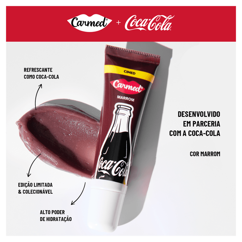 O Hidratante Labial Carmed Coca-Cola Marrom Efeito Gloss - 10g hidrata intensamente os lábios, proporcionando maciez e nutrição com efeito luminoso. Sua fórmula enriquecida com manteiga de cacau ajuda a prevenir o ressecamento, enquanto o efeito gloss realça a beleza natural dos lábios com um toque de cor marrom sofisticado. Ideal para uso diário, combina cuidado e estilo em um só produto.