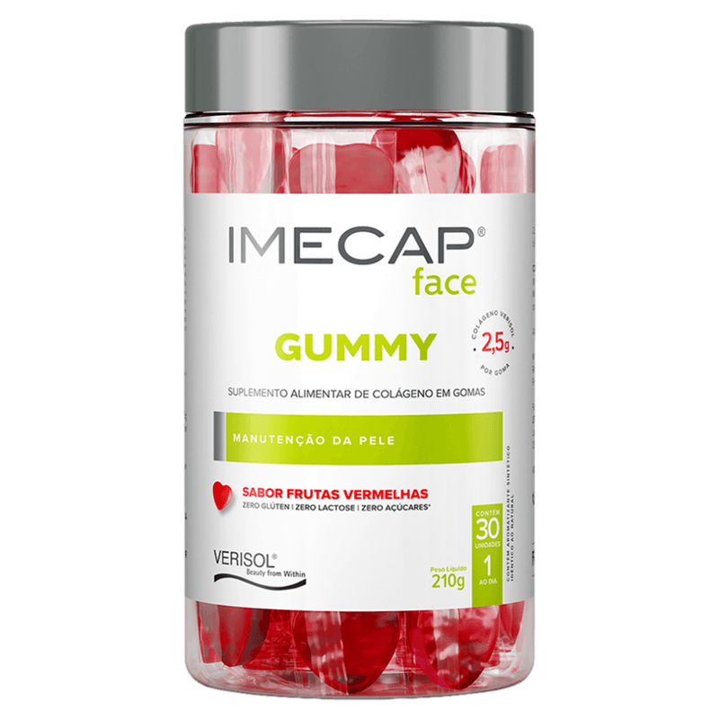 Imecap Face Gummy Frutas Vermelhas é um suplemento alimentar em gomas, desenvolvido com Colágeno Hidrolisado Verisol®, tecnologia alemã patenteada que atua diretamente na pele do rosto. Cada goma contém 2,5g de colágeno Verisol®, contribuindo para a firmeza, elasticidade e hidratação da pele, além de ajudar na redução de linhas finas e no rejuvenescimento facial. Com sabor agradável de frutas vermelhas, formato de coração e livre de glúten, lactose e açúcares adicionados, é uma opção prática e saborosa para o cuidado diário da pele. Ideal para adultos a partir de 19 anos que buscam manter a saúde e a beleza da pele de forma simples e eficiente.