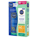 O Kit Nivea Sun Rotina de Autocuidado Completa inclui dois protetores solares: o Protetor Solar Corporal Protect & Hidrata FPS 50 em creme, que oferece proteção e hidratação para a pele do corpo, e o Protetor Solar Facial Beauty Oleosidade FPS 60 em textura leve, indicado para controle da oleosidade e proteção do rosto.