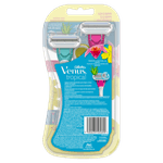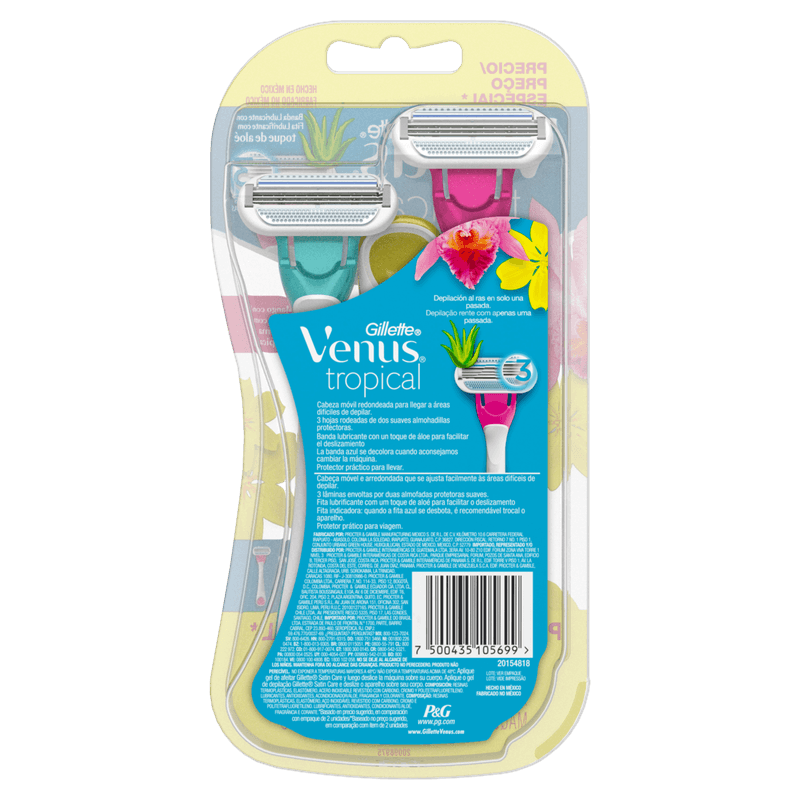 "Chegou Venus Tropical®, para uma depilação rente e suave em uma única passada! Suas 3 lâminas envoltas por duas almofadas protegem sua pele e sua cabeça móvel se ajusta as áreas difíceis de depilar. O cabo antideslizante com perfume floral oferece um ótimo controle durante a depilação.