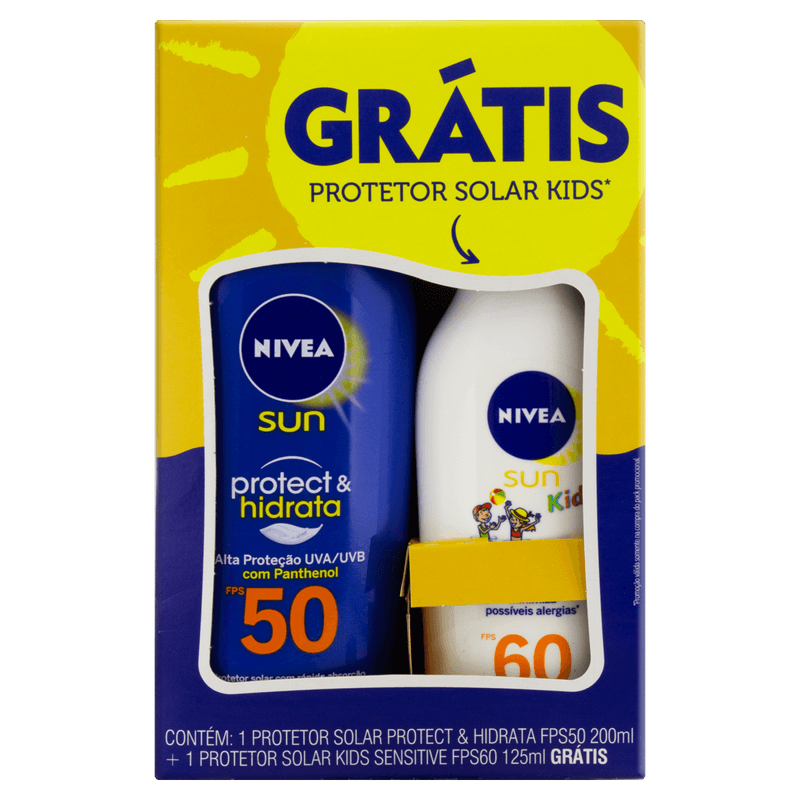O Kit Protetor Solar Nivea Sun inclui um protetor solar adulto FPS 50 em creme com 200 ml, indicado para proteção e hidratação da pele, e um protetor solar infantil FPS 60 em loção com 125 ml, formulado para peles sensíveis, oferecendo alta proteção contra os raios UVA e UVB.