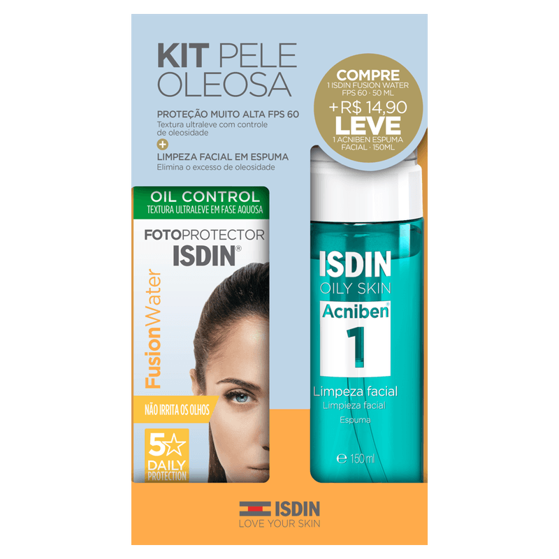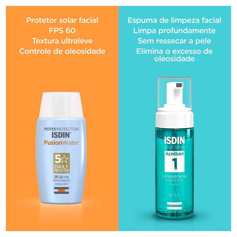 O Kit Isdin Fusion Water FPS 60 50ml + Acniben Espuma Limpeza 150ml é ideal para quem busca alta proteção solar aliada ao controle da oleosidade da pele. O protetor solar Fusion Water oferece FPS 60, textura ultraleve e rápida absorção, perfeito para peles oleosas, com fórmula aquosa que não deixa resíduos e pode ser aplicado até sobre a pele molhada. A espuma de limpeza Acniben, com 150 ml e pump prático, promove uma limpeza suave e eficaz, removendo o excesso de oleosidade e impurezas, indicada para peles oleosas e acneicas.