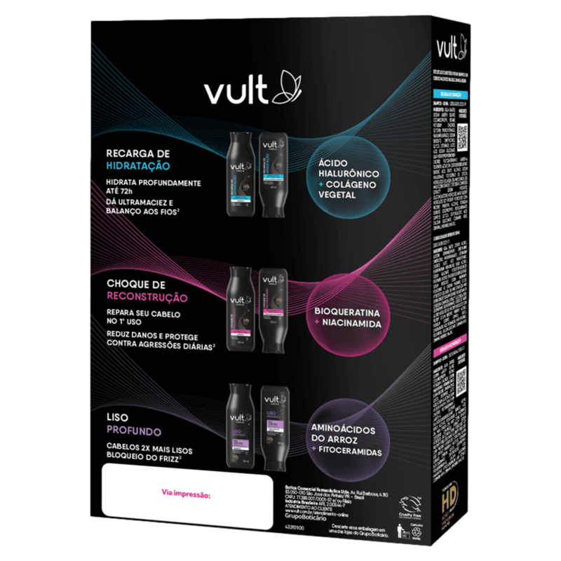 Ideal para quem vive no corre, mas não abre mão do autocuidado, esse tratamento capilar completo entrega resultados profissionais no seu dia a dia. E o melhor: com a qualidade Vult, uma marca 100% brasileira, democrática e cruelty free.