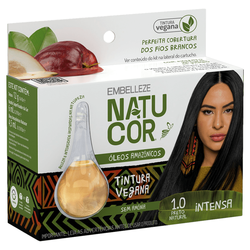 O Kit Tintura Creme Natucor Óleos Amazônicos na cor Preto Natural 1.0 é uma coloração permanente vegana, livre de amônia, formulada com ingredientes de origem vegetal, extrato natural de jambo e óleos amazônicos. Ideal para quem busca cobertura total dos fios brancos com uma cor intensa, duradoura e natural, além de nutrição profunda que restaura a vitalidade dos cabelos, deixando-os macios, brilhantes e com toque sedoso. Indicado para todos os tipos de cabelo, inclusive os fragilizados e sensíveis, é compatível com químicas como henê e fortalece as raízes enquanto revitaliza a fibra capilar.