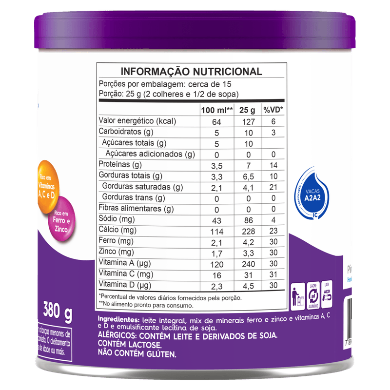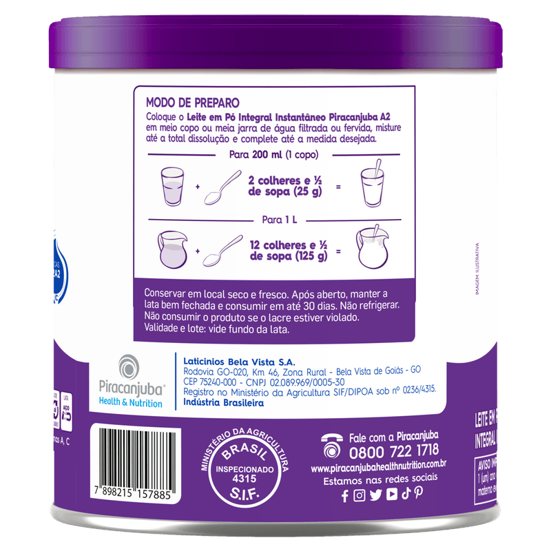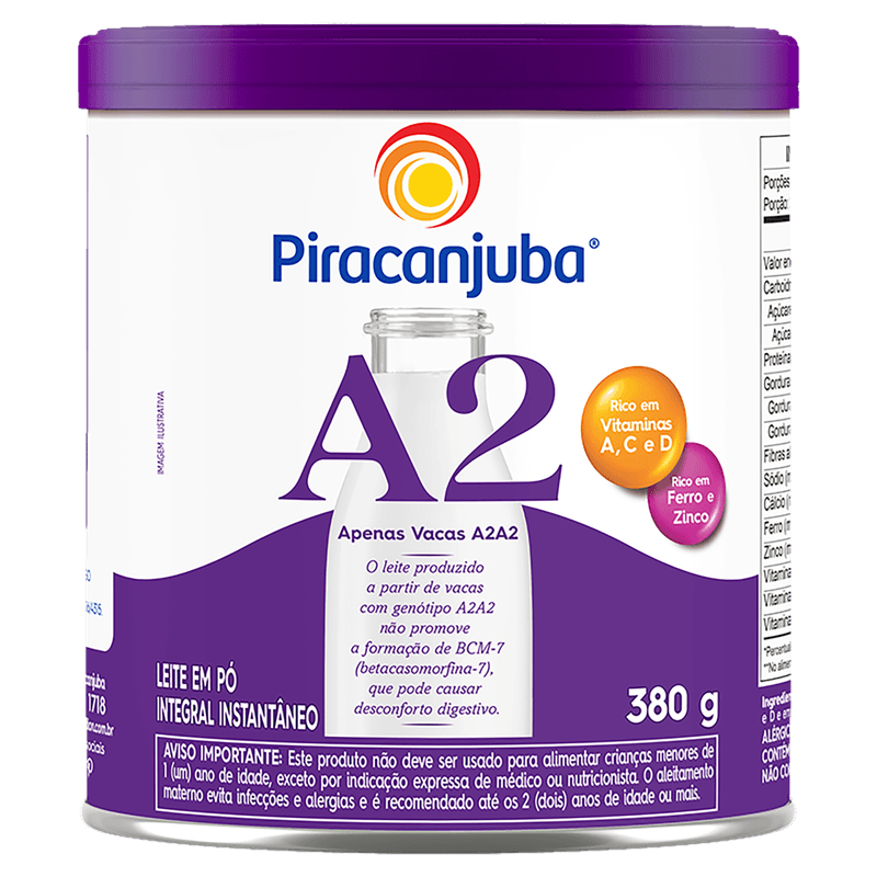 O Leite em Pó Integral Instantâneo Tipo A2 da Piracanjuba é indicado para todas as idades, especialmente para crianças e adultos que buscam uma alimentação nutritiva. É um leite em pó integral, contendo lactose e enriquecido com vitaminas A, C e D, além de minerais como ferro, zinco e cálcio, que contribuem para a saúde óssea e o aporte nutricional.