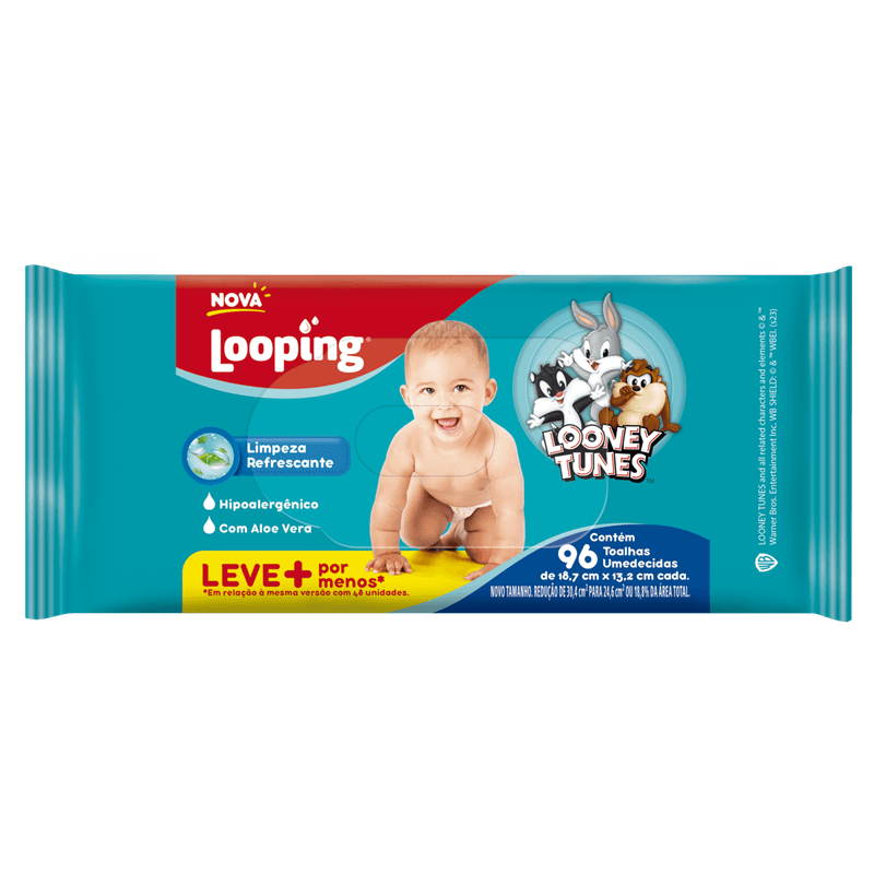 As Toalhas Umedecidas Looney Tunes Looping são lenços umedecidos infantis apresentados em embalagem com 96 unidades, indicados para a higiene diária de bebês e crianças. Enriquecidos com extrato de aloe vera e vitamina E, proporcionam hidratação e proteção para a pele sensível dos pequenos.