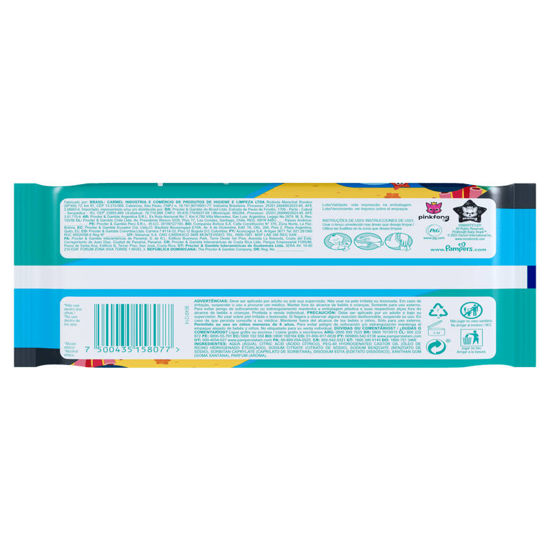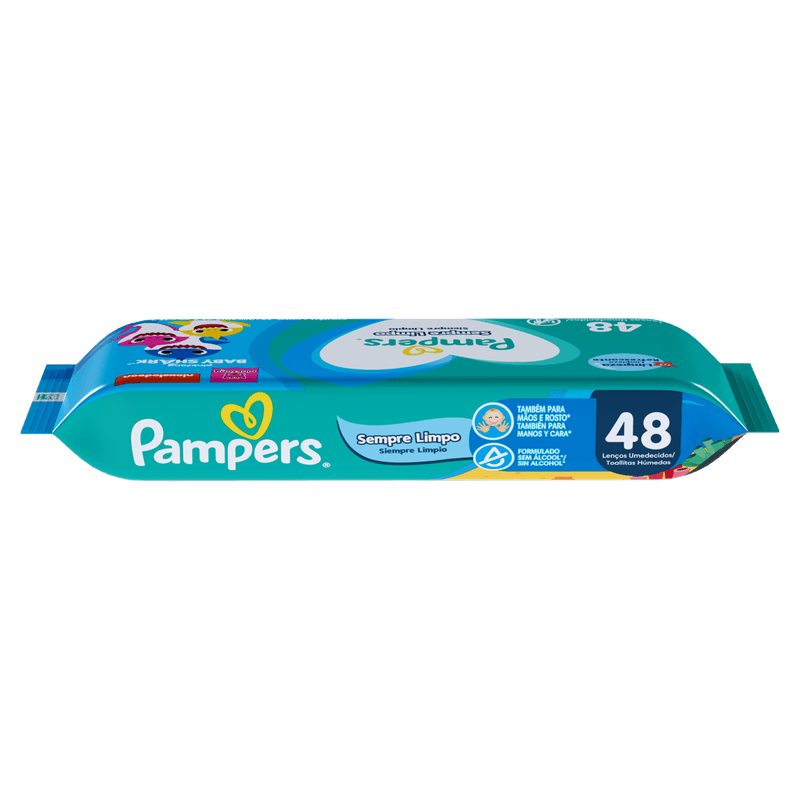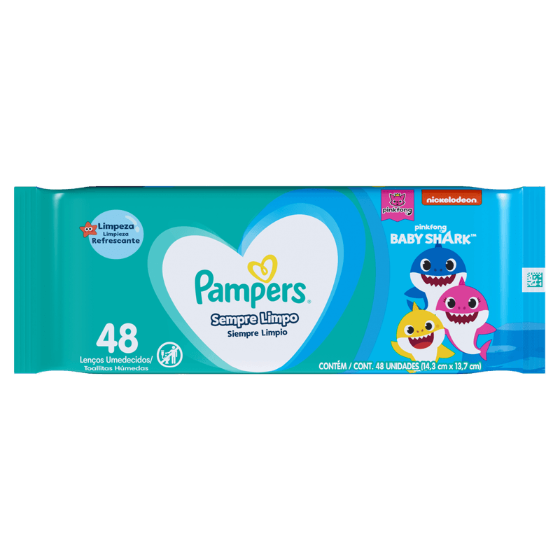 Os Lenços Umedecidos Baby Shark Pampers Sempre Limpo vêm em embalagem com 48 unidades, indicados para a limpeza suave e prática da pele de bebês e crianças. São ideais para higiene diária, proporcionando cuidado delicado sem agredir a pele sensível.
