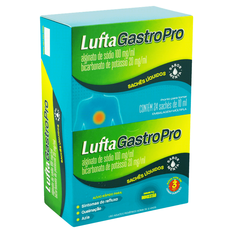 LuftaGastroPro Sabor Menta Sachê 10ml é um medicamento indicado para o alívio dos sintomas do refluxo gastroesofágico, como regurgitação ácida, queimação (azia) e dispepsia (má digestão). Também é eficaz em casos pós-cirúrgicos, hérnia de hiato, esofagite e refluxo supra-esofágico. Seu princípio ativo, o alginato de sódio, forma uma barreira protetora no estômago, proporcionando alívio rápido e duradouro. Com sabor menta, oferece uma sensação refrescante, facilitando o uso diário. Ideal para adultos, idosos e crianças acima de 12 anos que buscam conforto digestivo aliado à praticidade.