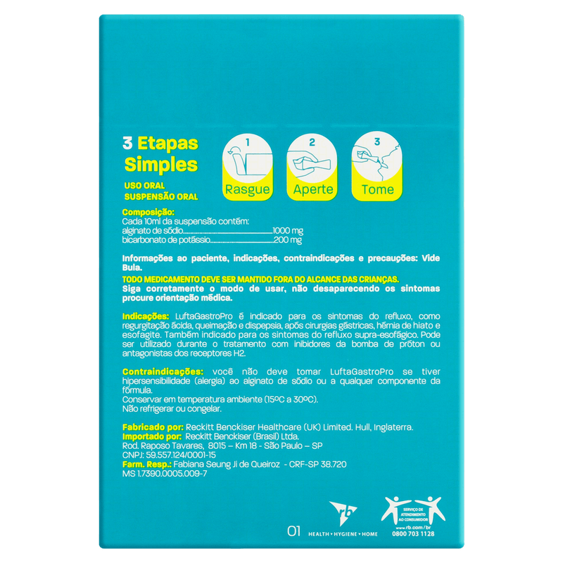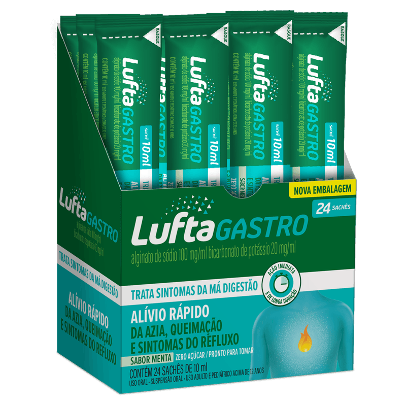 LuftaGastroPro atua diretamente na proteção da mucosa gástrica, reduzindo o desconforto causado pelo refluxo. Sua fórmula em suspensão oral facilita a administração, com textura leve e sabor agradável. Cada sachê contém 10 ml, ideal para transporte e uso prático em qualquer lugar. Produto de venda sob prescrição médica, indicado para adultos e crianças acima de 12 anos. A embalagem destaca instruções simples para uso: agite, aperte e tome, garantindo eficácia e comodidade no tratamento.