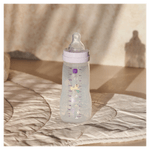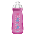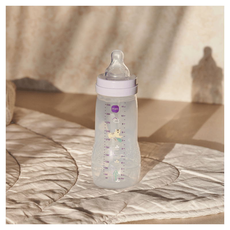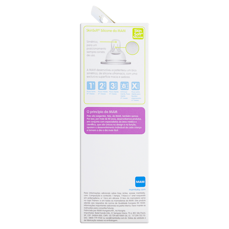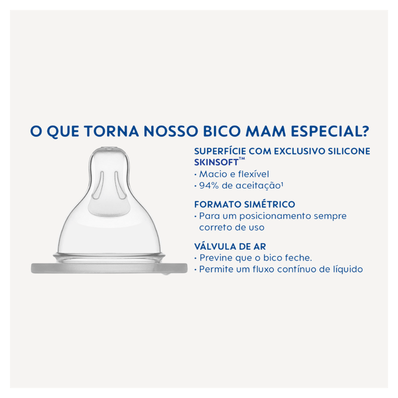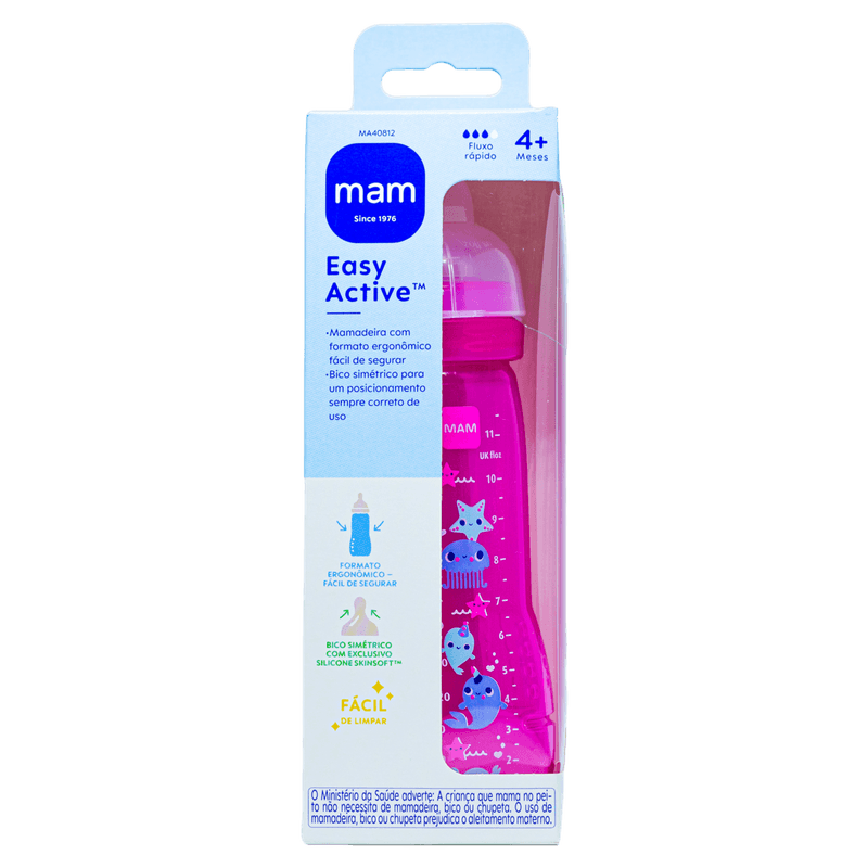 A Mamadeira Infantil Fashion Bottle Girl 330ml SkinSoft Silicone da MAM é um produto indicado para bebês a partir de 4 meses. Apresentada em um frasco de polipropileno translúcido com capacidade de 330 ml, possui bico de silicone com textura macia e formato anatômico, ideal para a alimentação confortável e segura dos pequenos.