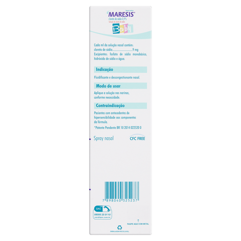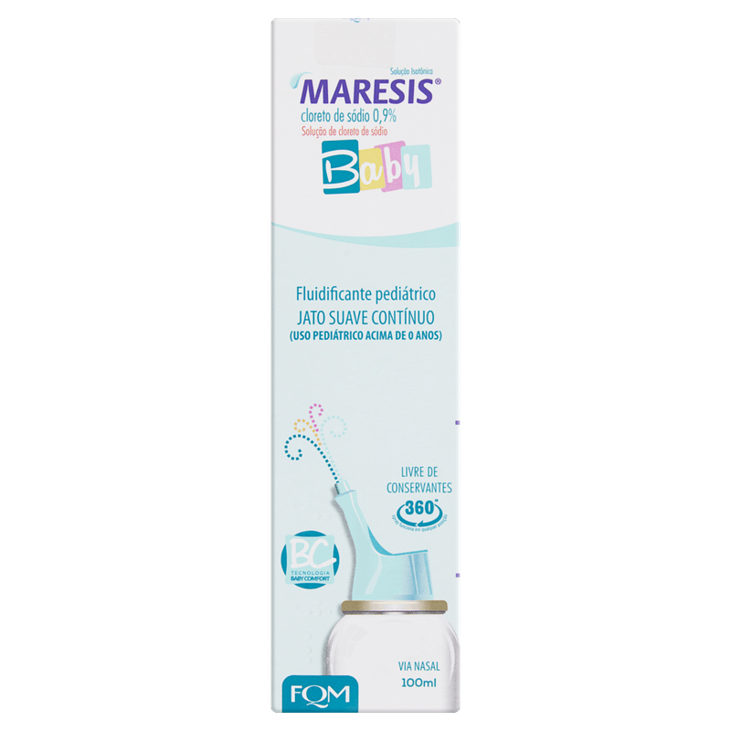Composto por solução aquosa de cloreto de sódio 0,9%, o Maresis Baby atua diretamente na umidificação e limpeza das vias nasais, facilitando a respiração e o conforto das crianças. Indicado para uso pediátrico acima de 0 anos, apresenta textura líquida em spray nasal, sem sabor e sem necessidade de receita médica. Produto registrado na Anvisa (MS 123456789), livre para venda, sem tarja, e com capacidade de 100 ml, ideal para uso diário e seguro.