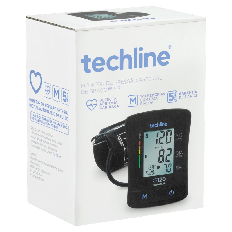 O Monitor de Pressão Arterial Digital de Braço BP-1209 da Techline é um aparelho automático com display LCD, desenvolvido para o monitoramento da pressão arterial e frequência cardíaca de forma prática e precisa.