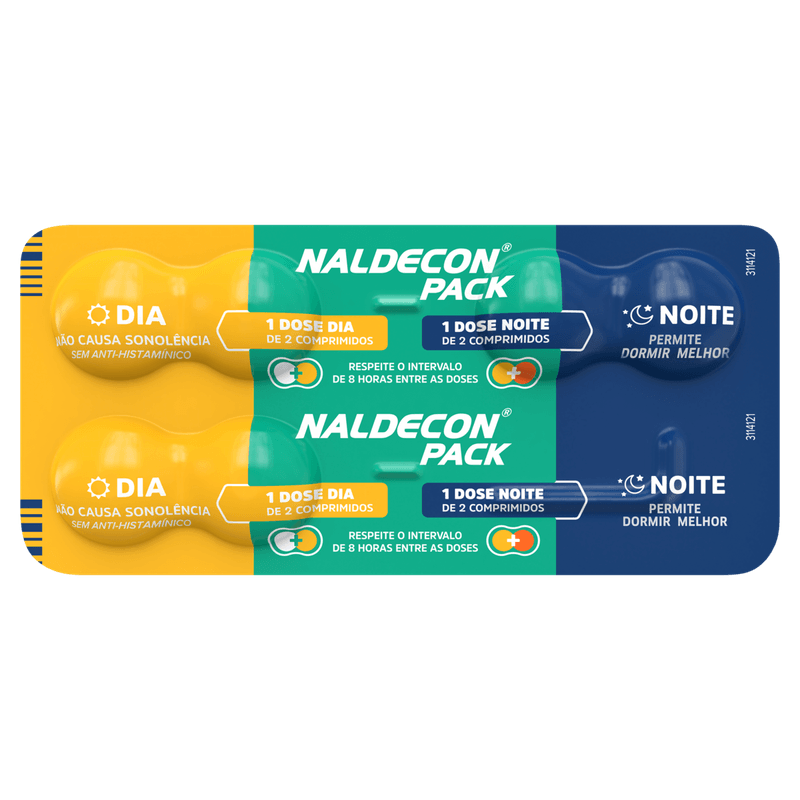 Naldecon Pack é um medicamento antigripal indicado para adultos e crianças acima de 12 anos, que combina paracetamol, cloridrato de fenilefrina e maleato de carbinoxamina para aliviar sintomas de gripe e resfriado, como dor, febre, congestão nasal e coriza. Sua fórmula diferenciada oferece comprimidos específicos para o dia (amarelo e branco) e para a noite (amarelo e laranja), garantindo ação analgésica, antitérmica, descongestionante e anti-histamínica, facilitando o descanso noturno.