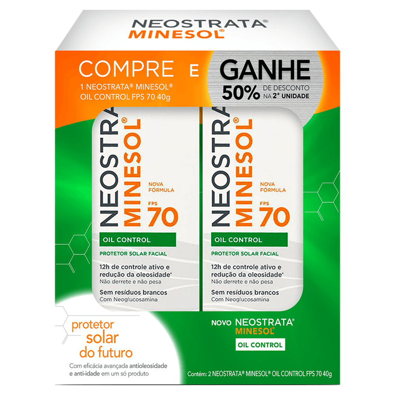 O Kit Protetor Solar NeoStrata Minesol Oil Control FPS 70 é composto por duas unidades de 40g cada, apresentando fórmula em gel creme indicada para peles mistas, oleosas e acneicas. Oferece alta proteção contra raios UVA, UVB, luz visível e poluição, com controle prolongado da oleosidade e efeito matte por até 12 horas.