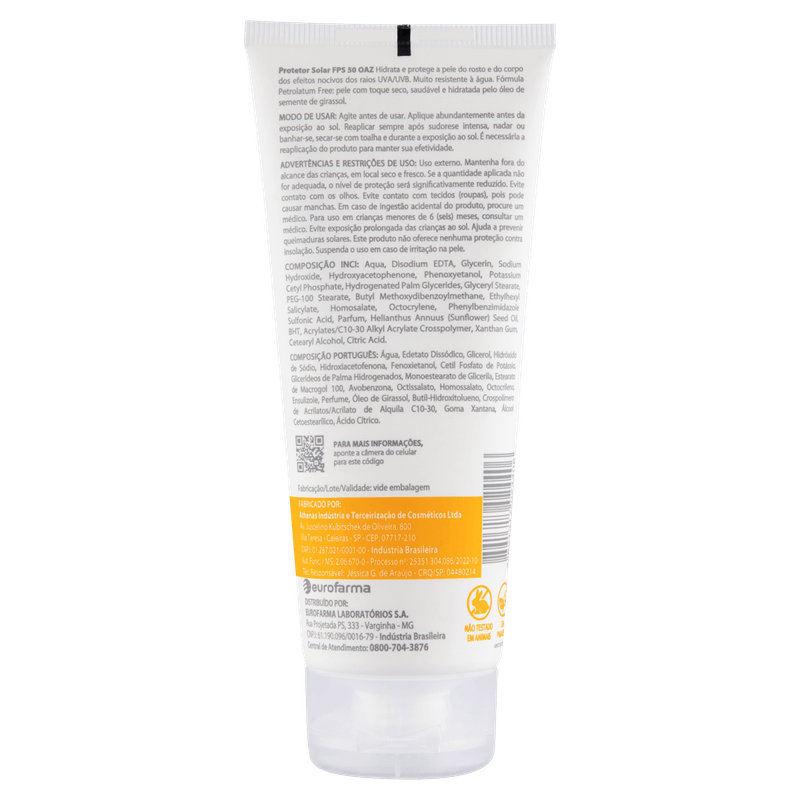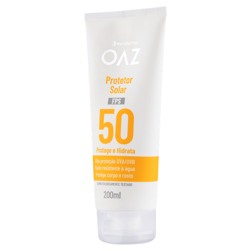 OAZ Protetor Solar FPS 50 é uma loção de 200 ml indicada para proteção alta contra os raios UVA e UVB, adequada para uso no rosto e corpo. Sua fórmula oferece toque seco, hidratação e é resistente à água, sem petrolatos, parabenos e é dermatologicamente testada.