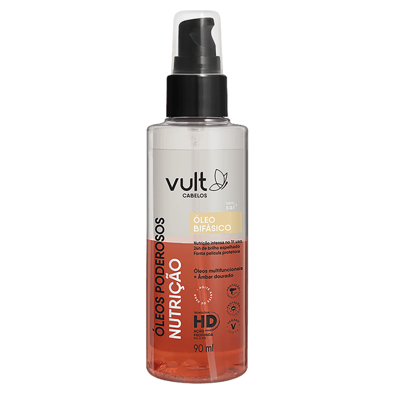 Vult Óleos Poderosos Nutrição, com óleos multifuncionais e âmbar dourado, nutre 2x mais, dá brilho espelhado, sem deixar os cabelos pesados.