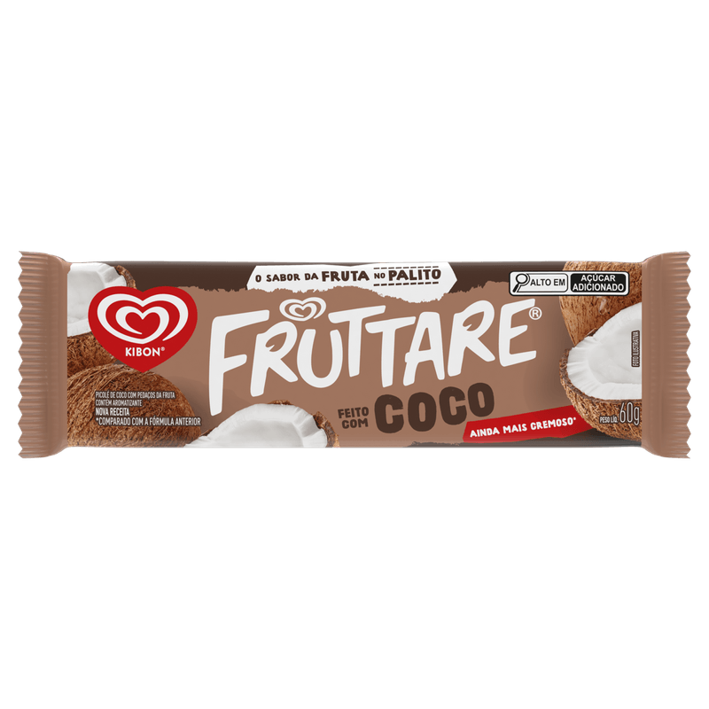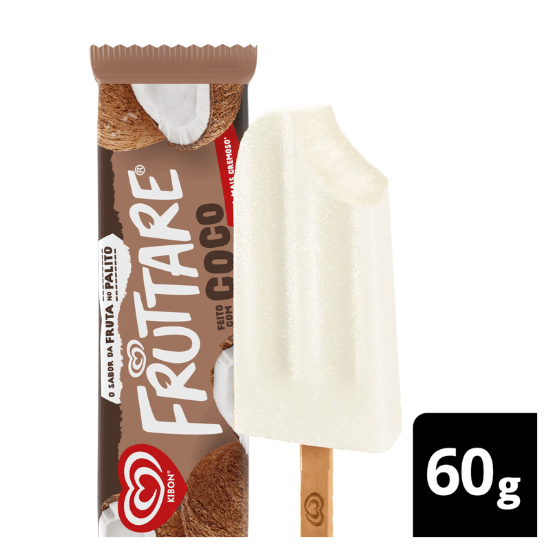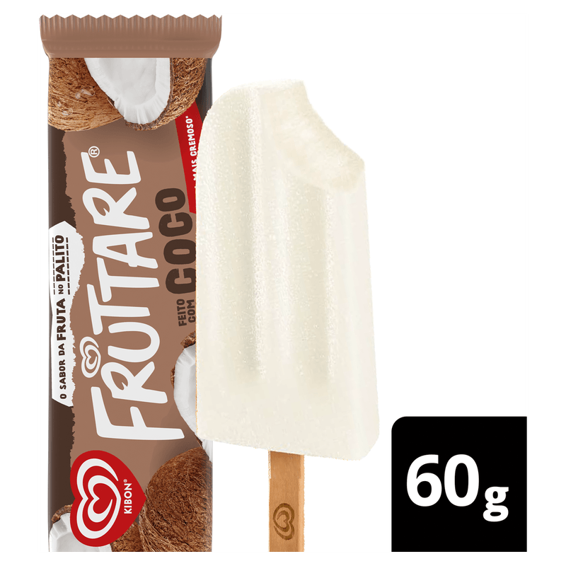 O Picolé Fruttare Palito Coco 60ml da Kibon é um doce do tipo picolé, apresentado em embalagem individual de 60ml. Sua principal finalidade é o consumo direto como sobremesa gelada.