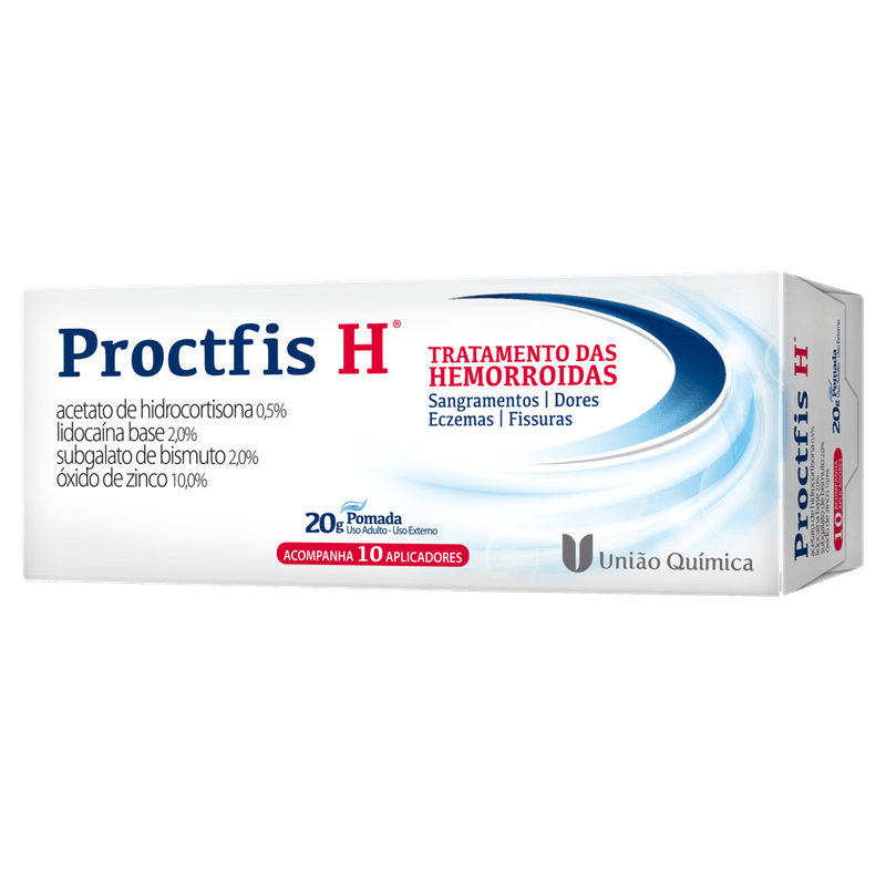 Cada embalagem contém 20g de pomada e 10 aplicadores, com textura cremosa que facilita a aplicação e absorção local. Proctfis H atua diretamente na redução dos sintomas das hemorroidas e outras condições anorretais, promovendo alívio rápido e proteção da pele. Produto sujeito a prescrição médica, indicado para adultos, com uso tópico e venda sob prescrição. Mantenha fora do alcance de crianças e não utilize em caso de alergia a qualquer componente da fórmula.