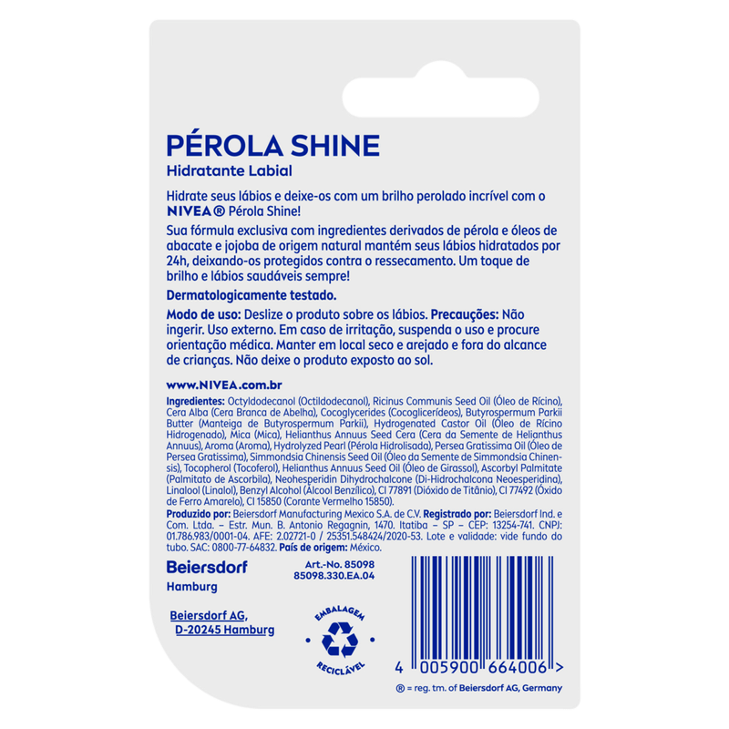 O Hidratante Labial Pérola Shine Nivea oferece hidratação intensa e proteção para os lábios, com um acabamento perolado que realça o brilho natural. Sua fórmula enriquecida com manteiga de karité, óleos nutritivos e pérola hidrolisada proporciona maciez, suavidade e um toque sofisticado, ideal para quem busca lábios hidratados e com aparência radiante.