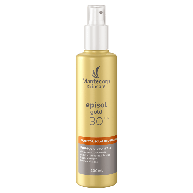 Protetor Solar Episol Gold FPS30 Protege & Bronzeia oferece alta proteção UVA e UVB, estimula a melanina para bronzeado intenso e duradouro. Com efeito iluminador, hidratante, e tecnologia que preserva o colágeno. Sua textura ultraleve é facilmente absorvida, não deixa resíduos e previne danos causados pelos raios infravermelhos. Protege contra câncer de pele, envelhecimento precoce. Resistente à água e ao suor, pode ser aplicado na pele molhada. Não comede gênico, dermatologicamente testado.