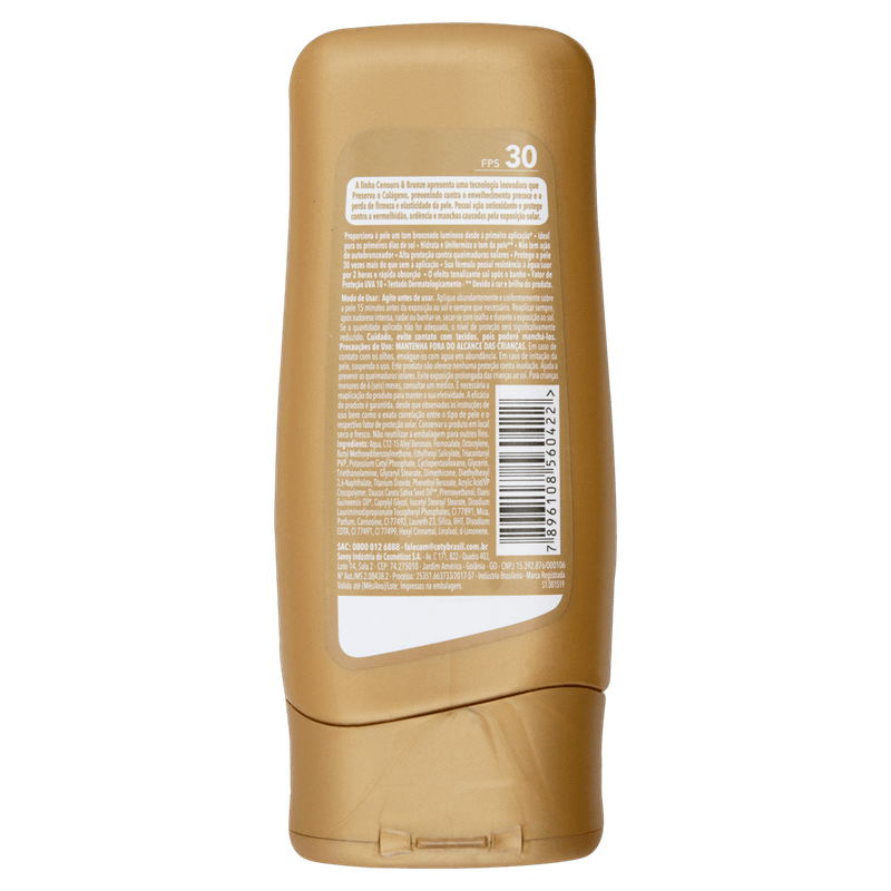O Protetor Solar com Cor Cenoura & Bronze FPS 30, em embalagem de 110 ml, é um protetor solar em creme com cor que oferece alta proteção contra os raios UVA e UVB, prevenindo queimaduras, vermelhidão e envelhecimento precoce da pele, além de proporcionar um bronzeado dourado e uniforme.