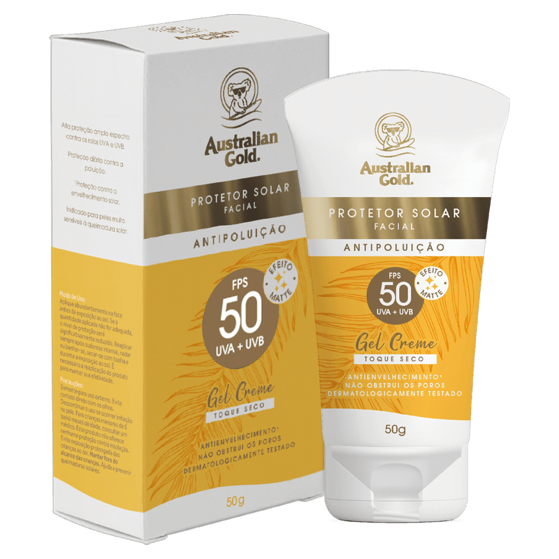 O Protetor Solar Facial Gel Creme Toque Seco FPS 50 Australian Gold Caixa 50g é um protetor solar em gel creme com textura leve e acabamento matte, indicado para proteção da pele contra os raios UVA e UVB. Possui FPS 50 e é formulado para oferecer alta proteção, hidratação e ação antipoluição, adequado para todos os tipos de pele, inclusive as muito sensíveis.