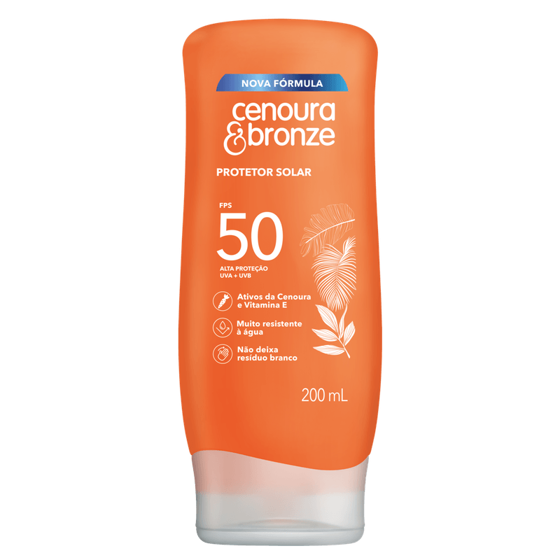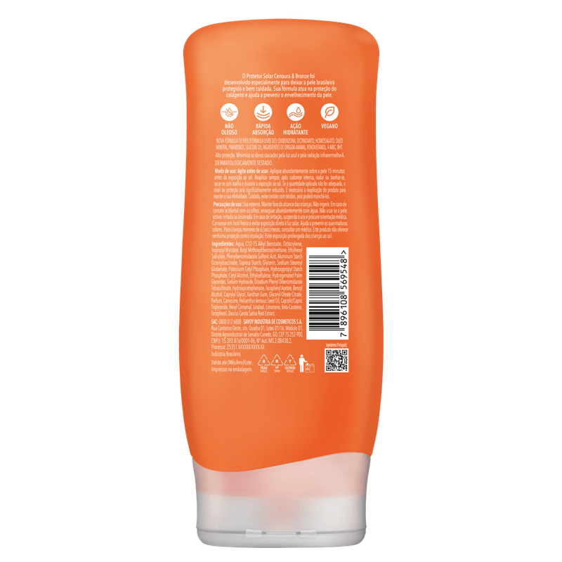 O Protetor Solar Cenoura Bronze Loção FPS 50 oferece alta proteção contra os raios UVA e UVB, ideal para quem busca cuidar da pele do corpo com segurança e eficácia. Sua fórmula enriquecida com ativos de cenoura e vitamina E proporciona ação antioxidante, ajudando a preservar a firmeza, elasticidade e o colágeno da pele, prevenindo o envelhecimento precoce. Resistente à água e ao suor por até duas horas, é indicado para todos os tipos de pele, inclusive as mais sensíveis, garantindo conforto e proteção sem deixar resíduos brancos.