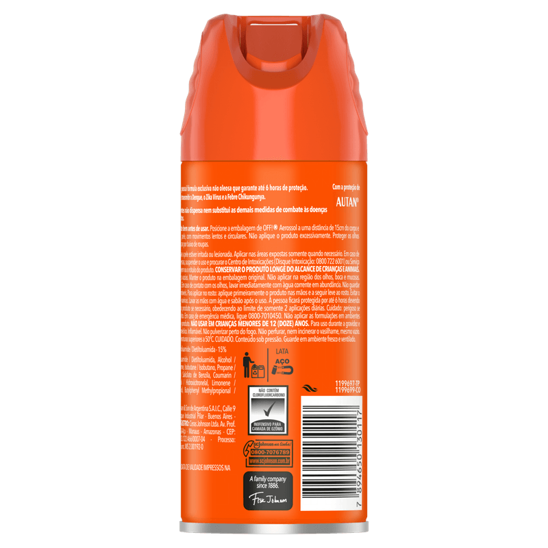 Indicada para adultos e crianças a partir de 12 anos, OFF Family é um repelente para insetos, em aerossol, que garante até 6 horas de proteção contra mosquitos, inclusive contra o Aedes Aegypti, mosquito que pode transmitir o Zika Vírus, a Dengue, a Febre Chikungunya e a Febre Amarela.