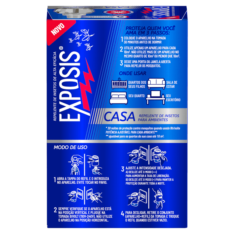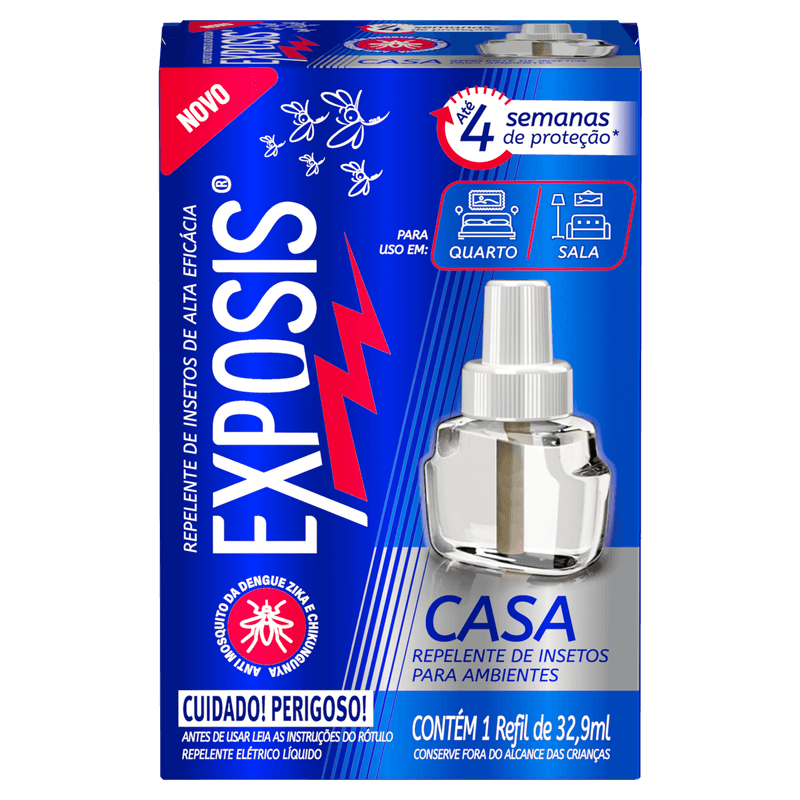 Exposis Casa Repelente Elétrico 30N RF32.9ML é o refil do repelente de insetos para ambiente da marca mais recomendada por médicos. Com alta eficácia, oferece proteção contra os mosquitos por até 30 noites, quando usado por oito horas por noite. Pode ser usado em áreas com crianças a partir dos 06 meses de idade.