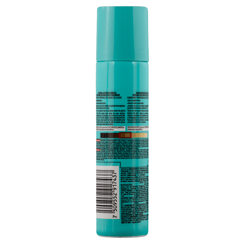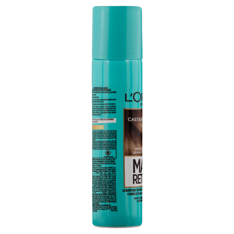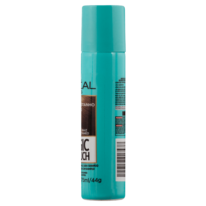 O corretivo instantâneo Magic Retouch é um spray que cobre as raízes brancas em apenas 3 segundos.O corretivo instantâneo Magic Retouch de L’Oréal Paris possui 75 ml, é uma maquiagem para cabelo, retoque de raiz, spray instantâneo e cobre temporariamente os fios brancos. Sai com shampoo, dura até 25 aplicações, retoca a raiz e é um spray instantâneo.São 5 tonalidades, escolha aquela que mais se adequa a cor dos seus fios, e fique com cabelo incrível e renovado em apenas alguns segundos!Indicado:Para cabelos normais.Modo de Usar:Testar em um papel a força do spray, antes de aplicar. Agitar o produto, aplicar nos cabelos secos a uma distância de 15 cm da raiz com a embalagem na vertical. Fazer jatos leves e precisos. Caso aplique muito, passe um pente para tirar o excesso.Sobre a Marca:L'Oréal é uma empresa multinacional francesa de cosméticos com sede em Clichy. Fundada por em 1909 por Eugéne Schueller, é especializada em produtos para cabelos (xampus e colorações), perfumes, protetores solares e produtos dermatológicos.