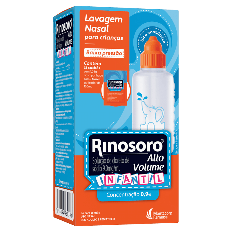 Rinosoro Alto Volume Infantil é uma solução nasal em pó à base de cloreto de sódio 9mg/ml, especialmente formulada para crianças. Seu principal diferencial é a capacidade de fluidificar a secreção nasal, descongestionando o nariz e facilitando a eliminação do muco, aliviando sintomas comuns de gripes, resfriados, rinite e sinusite. Além disso, é indicado para limpeza nasal diária e para auxiliar no pós-operatório de cirurgias nasais, oferecendo um cuidado seguro e eficaz para o público infantil.