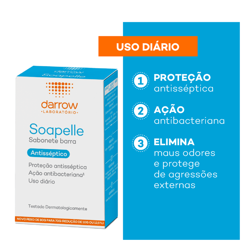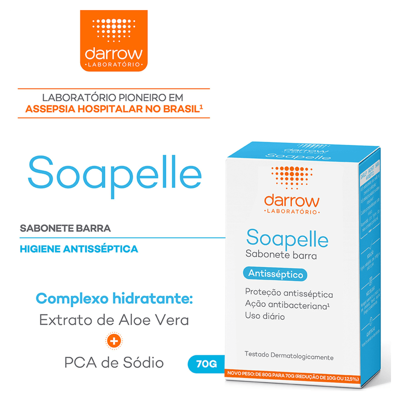 O Sabonete Barra Darrow Soapelle é ideal para a limpeza da pele, proporcionando frescor e suavidade. Com fórmula enriquecida, mantém a hidratação natural, sendo perfeito para uso diário. Indicado para todos os tipos de pele, é uma excelente opção que une eficácia e cuidado. Para melhores resultados, aplique sobre a pele molhada, massageando até formar espuma e enxágue. Evite contato com os olhos e mantenha fora do alcance de crianças. Dermatologicamente testado e livre de parabenos, garante segurança e qualidade. Com 70g, é prático para uso em casa ou em viagens. Sua fórmula contém Triclosano 1%, que ajuda na prevenção de infecções, eliminando até 99,9% dos micro-organismos prejudiciais. Além de limpar delicadamente, elimina maus odores e protege contra agressores externos. Ideal para quem busca um cuidado especial na higiene diária.