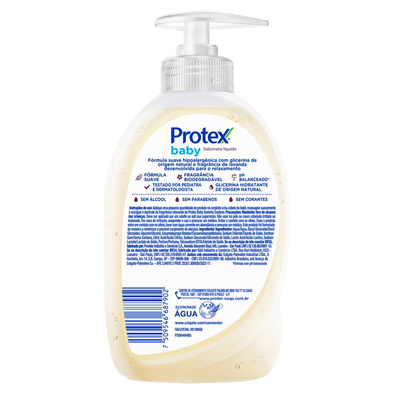 Sabonete líquido para bebê com glicerina de origem natural e fragrância de Lavanda desenvolvida para o relaxamento Essa linha de sabonete líquido da cabeça aos pés de Protex Baby é hipoalergênico e tem glicerina de origem natural, que ajuda a hidratar a pele do seu(ua) pequeno(a) naturalmente. Tem mais: a glicerina também mantém a barreira protetora da pele dos bebês para que ela fique saudável e macia. E sua fórmula suave é sem álcool, sem corantes e sem parabenos. São produtos criados especialmente para momentos inesquecíveis, como o banho em bebê recém-nascido.