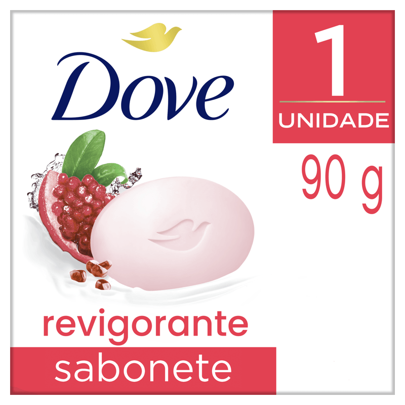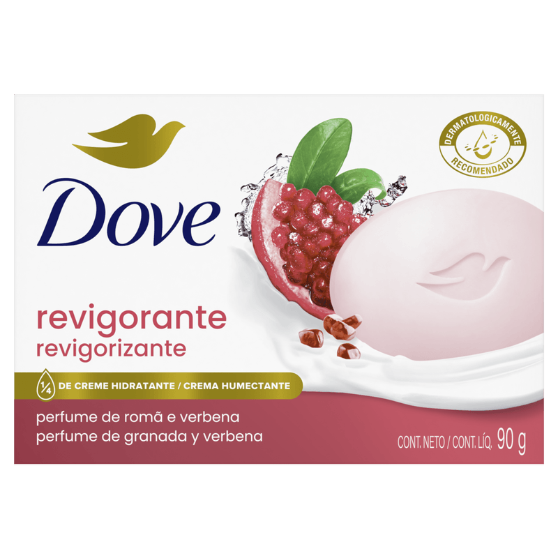• O Sabonete em Barra Hidratante Dove Revigorante Romã e Verbena hidrata sua pele, pois possui 1/4 de creme hidratante em sua composição