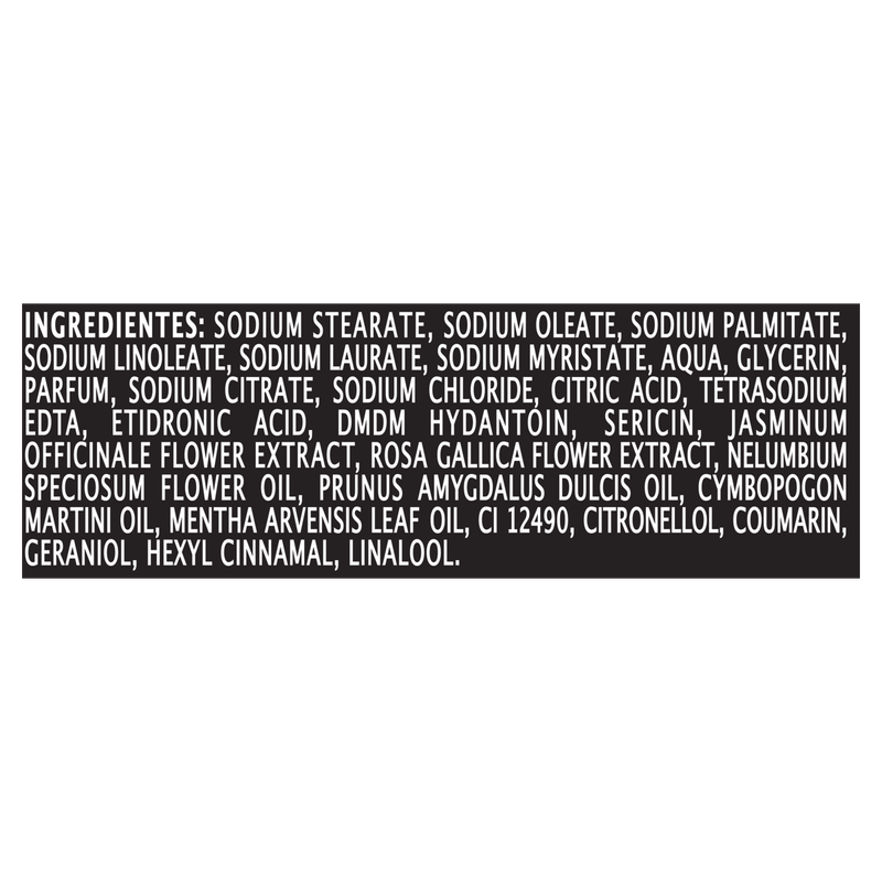 Composição: Sodium stearate, sodium oleate, sodium palmitate, sodium linoleate, sodium laurate, sodium myristate, aqua, glycerin, parfum, sodium citrate, sodium chloride, citric acid, tetrasodium EDTA, etidronic acid, dmdm hydantoin, sericin, jasminum officinale flower extract, rosa gallica flower extract, nelumbium speciosum flower oil, prunus amygdalus dulcis oil, cymbopogon martini oil, mentha arvensis leaf oil, CI 12490, citronellol, coumarin, geraniol, hexyl cinnamal, linalool.