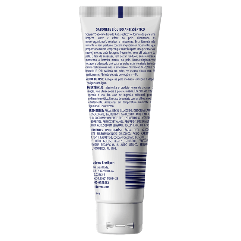 Com ação antisséptica comprovada, o Soapex atua na limpeza diária, controlando a oleosidade e prevenindo o ressecamento. Apresentado em bisnaga prática de 100ml com tampa flip-top, é fácil de transportar e ideal para uso doméstico ou em viagens. Sua textura líquida e cremosa proporciona fácil aplicação e enxágue, sem deixar resíduos.