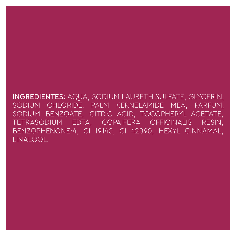 Composição: Aqua, sodium laureth sulfate, glycerin, sodium chloride, palm kernelamide mea, parfum, sodium benzoate, citric acid, tocopheryl acetate, tetrasodium edta, copaifera officinalis resin, benzophenone-4, CI 19140, CI 42090, hexyl cinnamal, linalool.