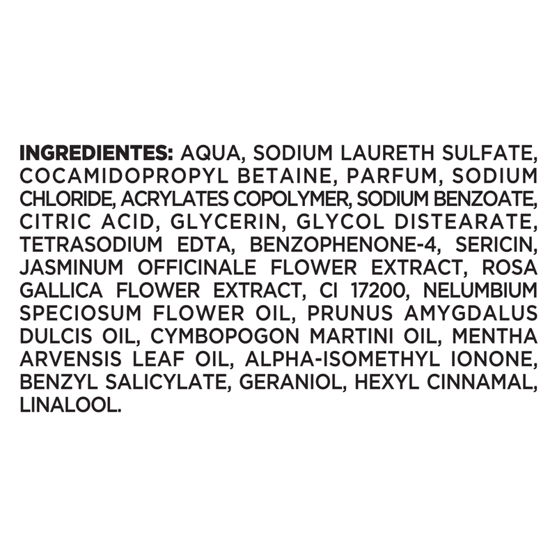 Aqua, sodium laureth sulfate, sodium chloride, cocamide MEA, parfum, acrylates copolymer, glycerin, glycol distearate, benzophenona-4, DMDM hydantoin, tetrasodium EDTA, BHT, citric acid, sodium hydroxide, PPG-9, rosa gallica flower extract, jasminum officinale flower extract, prunus amygdalus dulcis oil, nelumbium speciosum flower oil, methylchloroisothiazolinone, hydrolyzed silk, mentha arvensis leaf oil, cymbopogon martini oil, methylisothiazolinone, CI 17200, alpha-isomethyl ionone, benzyl salicylate, butylphenyl methylpropional, geraniol, hexyl cinnamal, linalool.