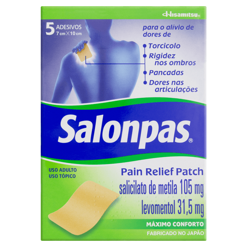 Este produto atua diretamente na área afetada, promovendo alívio rápido e prolongado da dor e inflamação. Indicado para adultos, é um medicamento de uso tópico, sem necessidade de prescrição, com embalagem contendo 5 adesivos de 7 cm x 10 cm. Sua textura fina e flexível facilita a movimentação, tornando-o ideal para uso em regiões como ombros, costas e articulações. SALONPAS® PAIN RELIEF É UM MEDICAMENTO. SEU USO PODE TRAZER RISCOS. PROCURE O MÉDICO E O FARMACÊUTICO. LEIA A BULA. SE PERSISTIREM OS SINTOMAS, O MÉDICO DEVERÁ SER CONSULTADO.