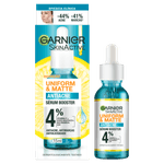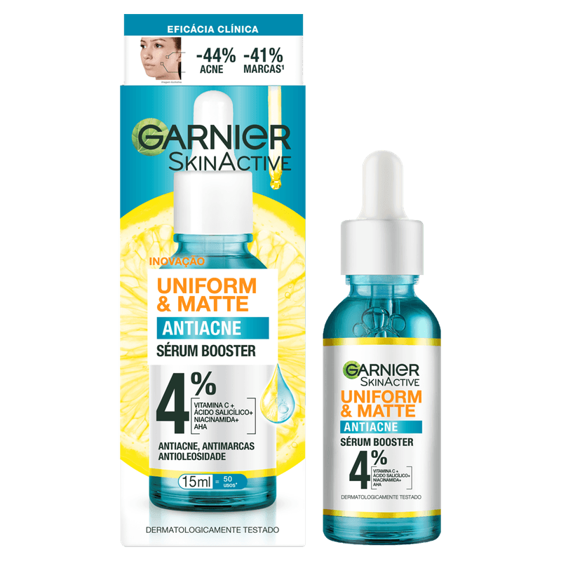 O Garnier Uniform & Matte Antiacne é um sérum booster, de textura não oleosa, formulado com 4% de concentração de Vitamina C + Ácido Salicílico + Niacinamida + AHA.