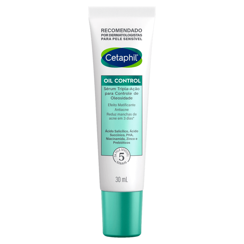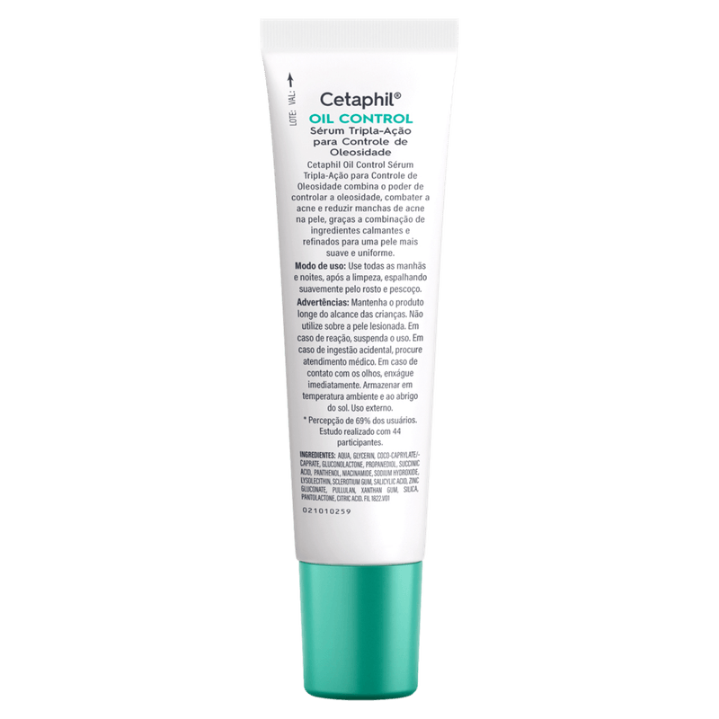 O Sérum Facial Tripla Ação Cetaphil - Oil Control é um produto inovador que combina o poder de controlar a oleosidade, combater a acne e reduzir manchas de acne na pele. Com uma fórmula rica em ingredientes como ácido salicílico, ácido succínico, PHA, niacinamida, zinco e prebióticos, ele proporciona uma pele mais suave e uniforme. O ácido salicílico atua diminuindo a produção de sebo, desobstruindo os poros e melhorando a textura da pele. Ideal para quem possui pele oleosa e acneica, este sérum deve ser utilizado todas as manhãs e noites, após a limpeza, aplicando suavemente no rosto e pescoço. É importante manter o produto fora do alcance de crianças e não utilizá-lo sobre a pele lesionada. Em caso de reações adversas, suspenda o uso e procure orientação médica. Armazenar em temperatura ambiente e ao abrigo do sol. O produto é indicado para o controle de manchas, poros dilatados, desobstrução de poros, controle da acne e controle da oleosidade. Clinicamente comprovado para reduzir espinhas e cravos, é livre de fragrância e não comedogênico, tornando-se uma excelente opção para peles oleosas e acneicas.