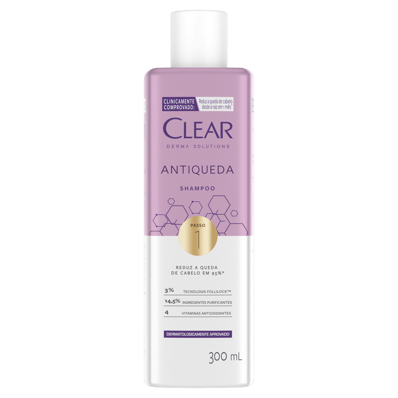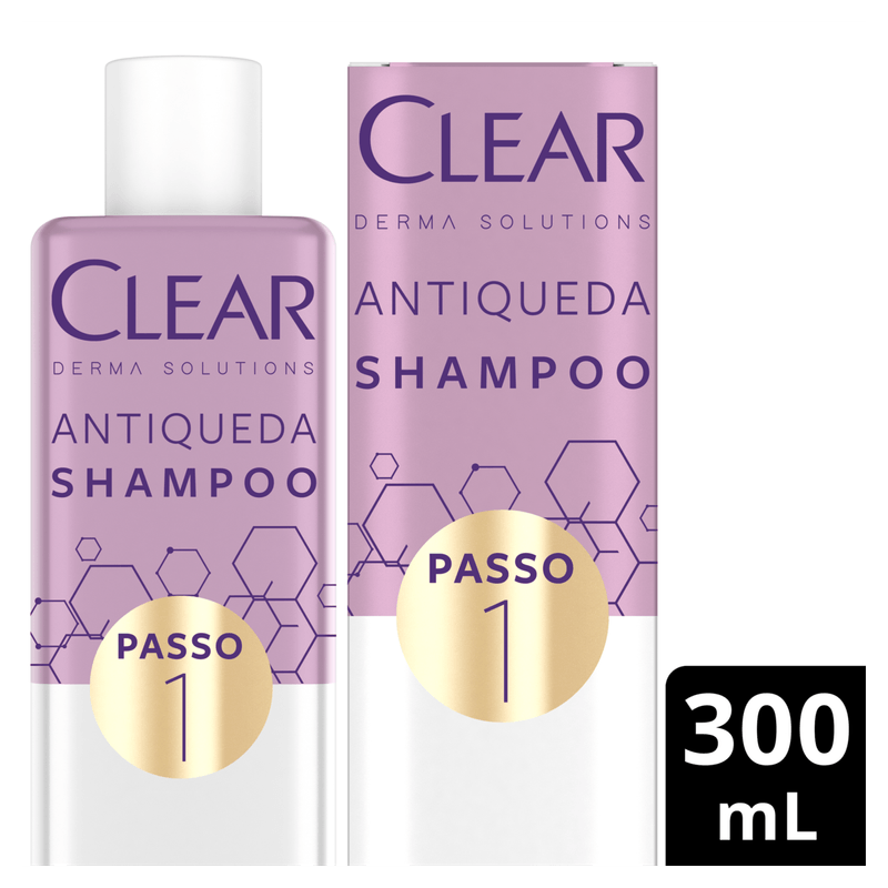 O Shampoo Antiqueda Clear Derma Solutions é uma nova linha de tratamento exclusivo da Clear, composta por 3 passos, que reduz a queda de cabelo desde a raiz em 1 mês de uso contínuo.