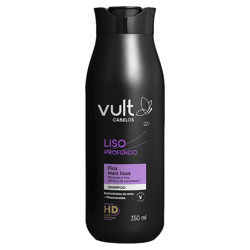 O Shampoo Vult Liso Profundo limpa os cabelos de forma eficaz, desembaraçando-os sem ressecar. Sua fórmula hidratante com Aminoácidos do arroz e Fitoceramidas forma uma espuma cremosa que combate o frizz, alinha os fios e proporciona movimento natural.
