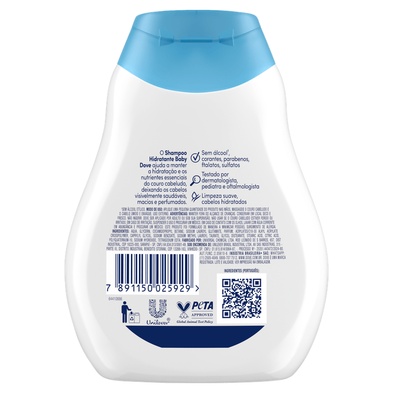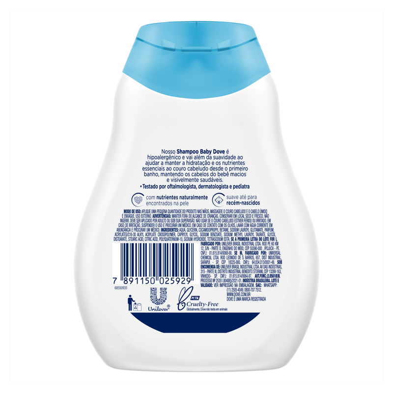 O Baby Dove Shampoo Hidratação Enriquecida Cabelos Cacheados é enriquecido com 1/4 de creme hidratante, que ajuda a repor os nutrientes essenciais que o couro cabeludo do seu bebê pode perder durante o banho.