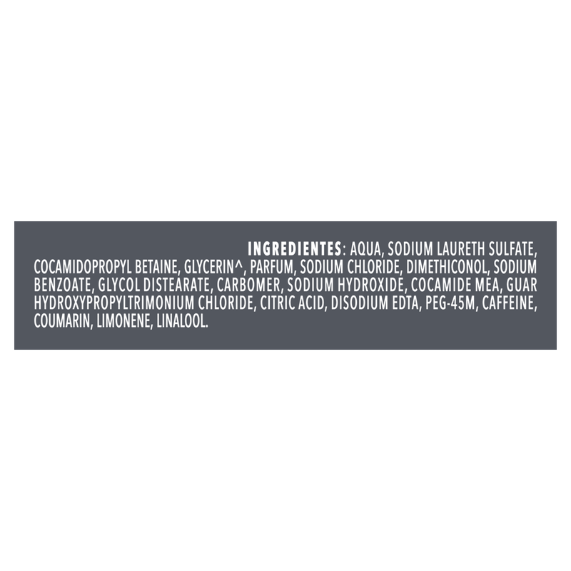 Composição: Aqua, sodium laureth sulfate, cocamidopropyl betaine, glycerin, parfum, dimethiconol, glycol distearate, carbomer, guar hydroxypropyltrimonium, chloride, cocamide mea, styrene/acrylates copolymer, disodium EDTA, DMDM hydantoin, PEG-45M, calcium glycerophosphate, caffeine, methylchloroisothiazolinone, methylisothiazolinone, butylphenyl methylpropional, coumarin, limonene, linalool, sodium chloride, citric acid, sodium hydroxide.
