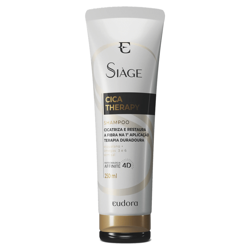 O Shampoo Siàge Cica-Therapy limpa suavemente sem ressecar, cicatrizando áreas danificadas e protegendo os fios com Esqualano e Ômegas 3 e 6.