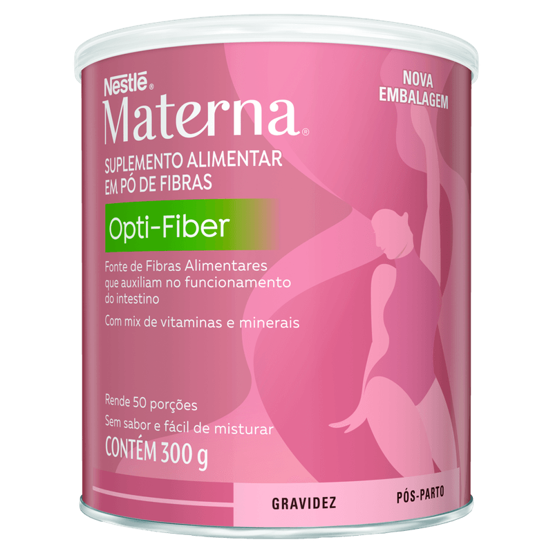Materna Opti-Fiber atua diretamente na regulação do trânsito intestinal, prevenindo a constipação comum na gravidez, e contribui para o fortalecimento do sistema imunológico, fundamental nesse período. Indicado para mulheres grávidas e em fase de amamentação, apresenta textura em pó, fácil de dissolver, e não contém açúcares, gorduras ou proteínas em quantidades significativas. Produto sem sabor, com 300g de capacidade, ideal para uso diário conforme recomendação médica, garantindo segurança e eficácia para a saúde materna.