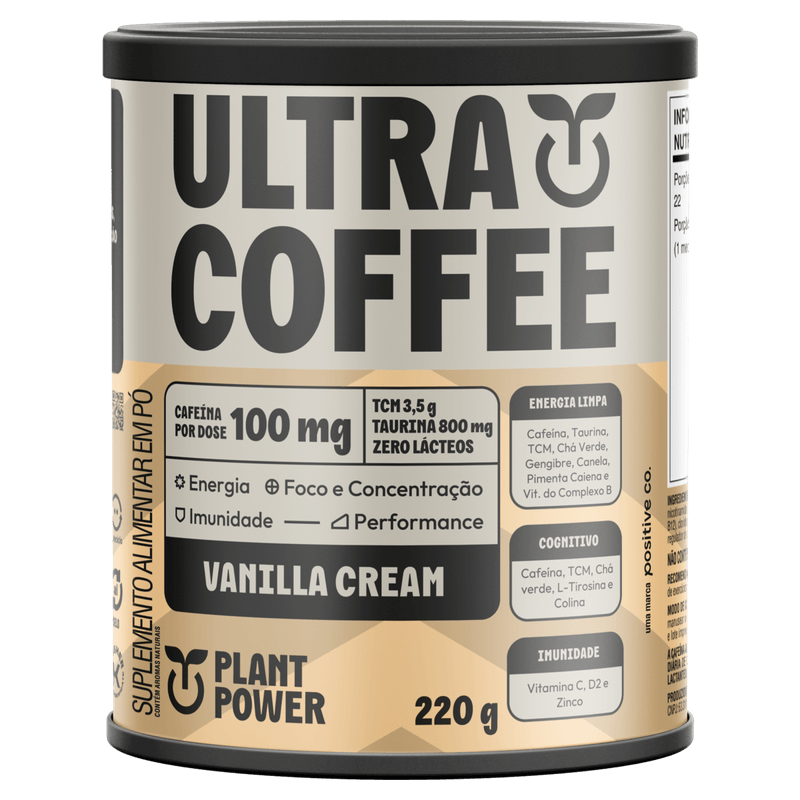 O Ultra Coffee Plant Power Vanilla Cream é um suplemento alimentar em pó de 220g com sabor suave de baunilha, formulado para fornecer energia rápida, foco e suporte imunológico. Com 100mg de cafeína natural, TCM, taurina e vitaminas essenciais, este produto 100% natural auxilia na queima de gordura, metabolismo e recuperação muscular, ideal para adultos que praticam atividades físicas ou precisam de concentração e produtividade no trabalho intelectual.