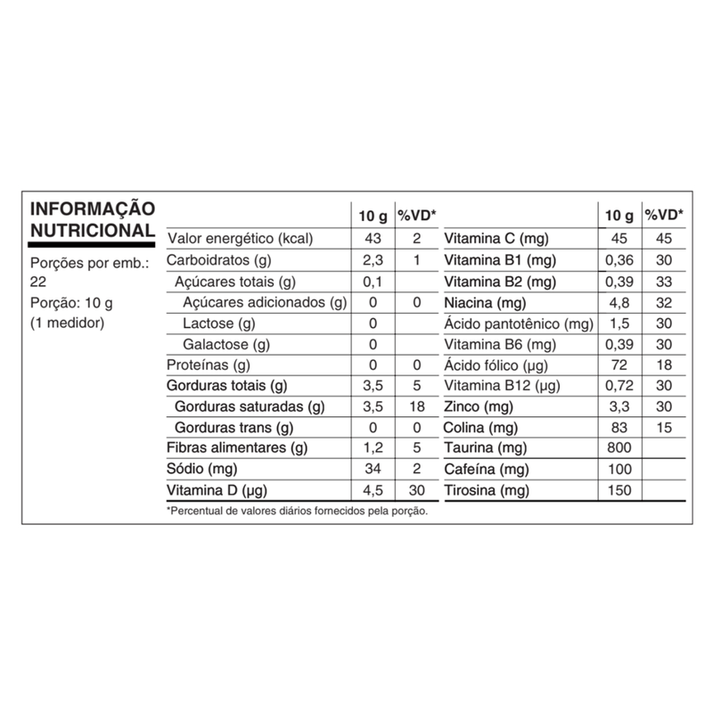 Este suplemento atua como pré-treino e apoio nutricional, combinando ingredientes como vitaminas do complexo B, vitamina C, D2, zinco e extratos naturais de chá verde, gengibre, canela e pimenta caiena. Livre de lactose, glúten e açúcares adicionados, apresenta textura em pó, fácil de preparar e consumir, sendo uma opção prática para quem busca energia, foco e reforço imunológico com qualidade e segurança.