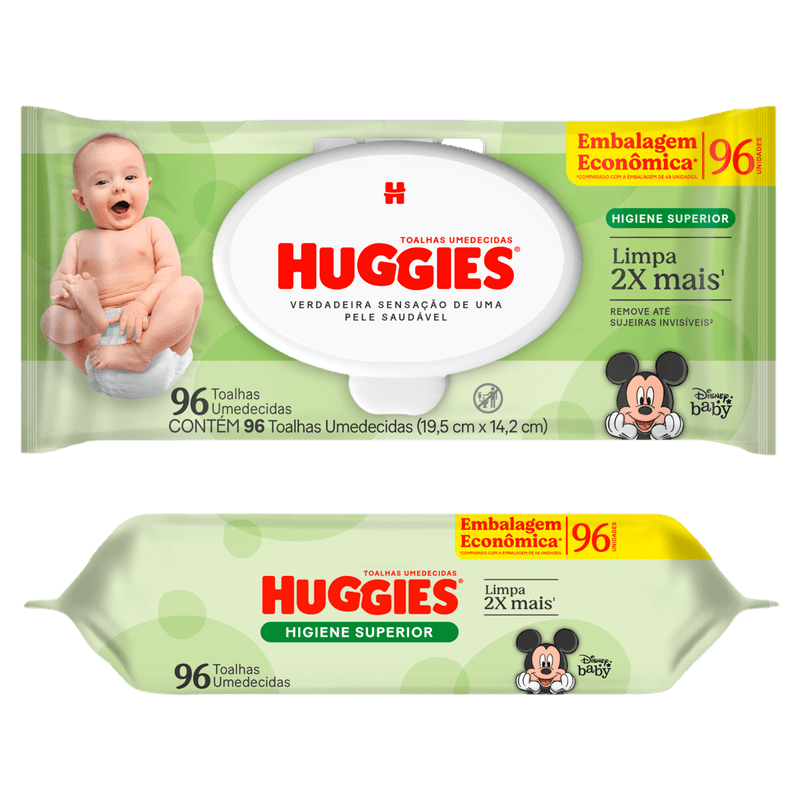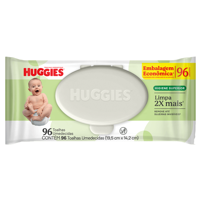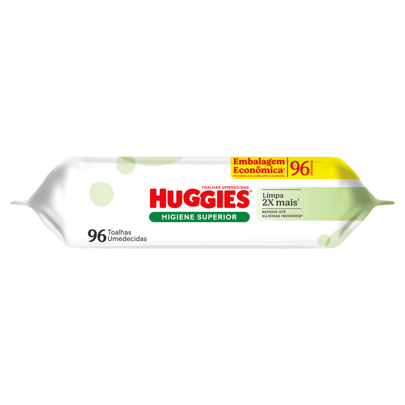 Os Lenços Umedecidos Huggies Higiene Superior são indicados para a limpeza suave e eficaz da pele sensível de bebês e crianças. Apresentados em embalagem com 96 unidades, esses lenços promovem higiene diária, removendo sujeiras invisíveis sem agredir a pele, com fórmula dermatologicamente testada, livre de álcool e parabenos.